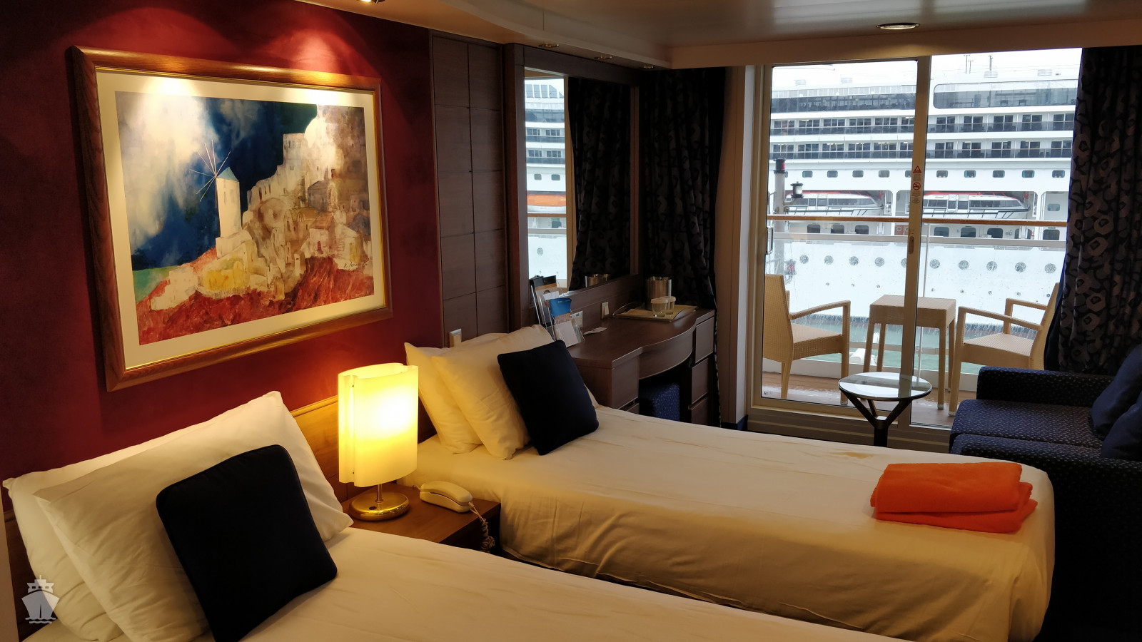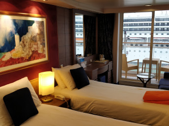 Suite s balkónem: cca 31 m², kajuta s manželskou postelí (na požádání 2 oddělené postele) a rozkládací pohovka. Klimatizace, koupelna s vanou a WC, toaletní stolek, prostorná skříň, interaktivní TV, telefon, minibar, sejf, vysoušeč vlasů. Balkon se stolkem a židlemi.
