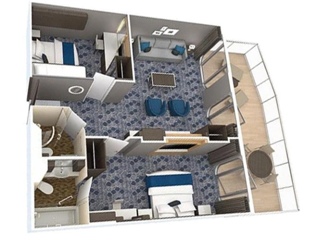 | A2 - AquaTheatre Suite s balkonem / 2 ložnice 62,5 m² / balkon 56 m². Výhody Royal Suite Class. 9/10. paluba. Max 8 osob. | 498 676 Kč 249 338 Kč za osobu |