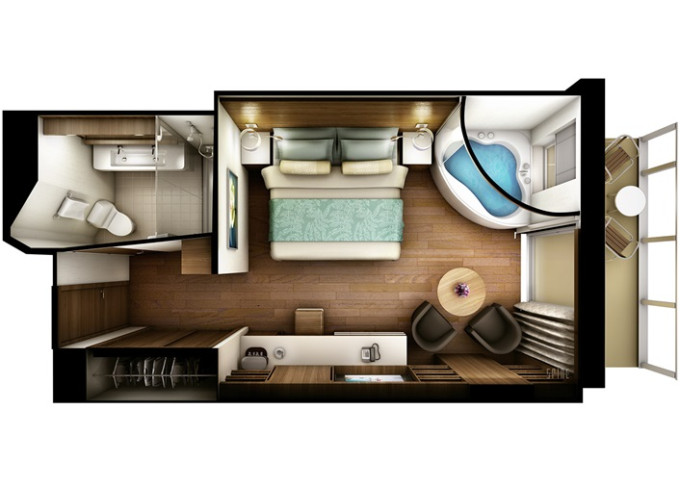 H6 - The Haven Family Villa - 2 ložnice 50 m² / balkon 4 m².Výhody The Haven. 17/18. paluba - vpředu. Max 6 osob. 138 446 Kč 69 223 Kč za osobu