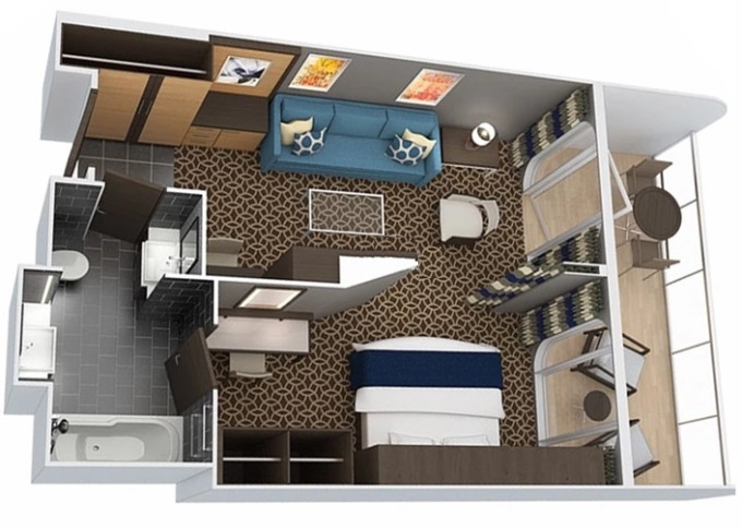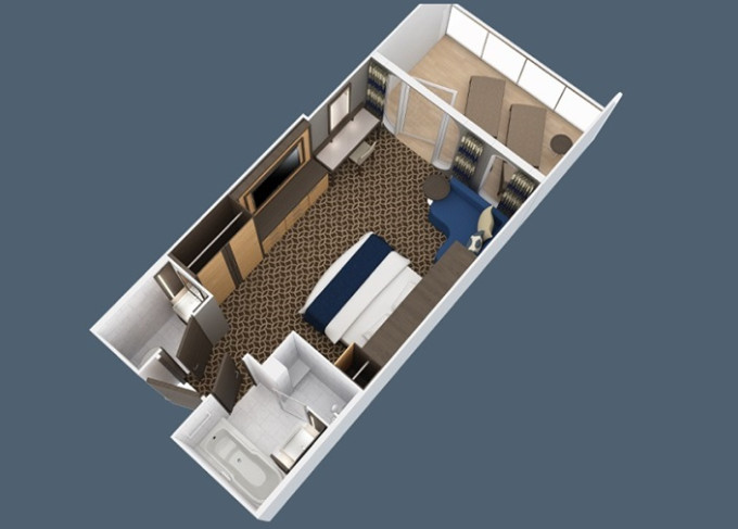 | 2U - Vnitřní kajuta s virtuálním balkonem 17 m². Obrazovka velkosti balkonových dverí s promítaným výhledem. 9/10. paluba. Max 2 osoby. | 68 525 Kč 22 842 Kč za osobu | ||