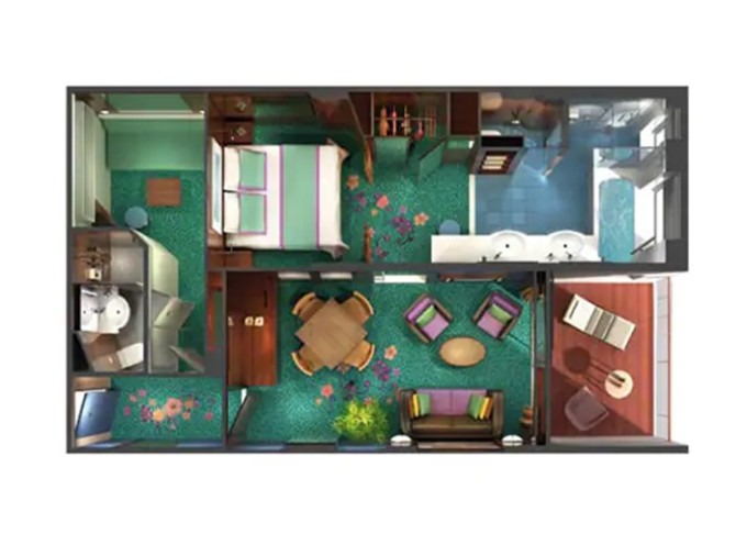 Suite: luxusní varianta ubytování na nejlepších místech na lodi, prostorné a luxusně vybavené; více variant včetně suite v privátní zóně The Haven