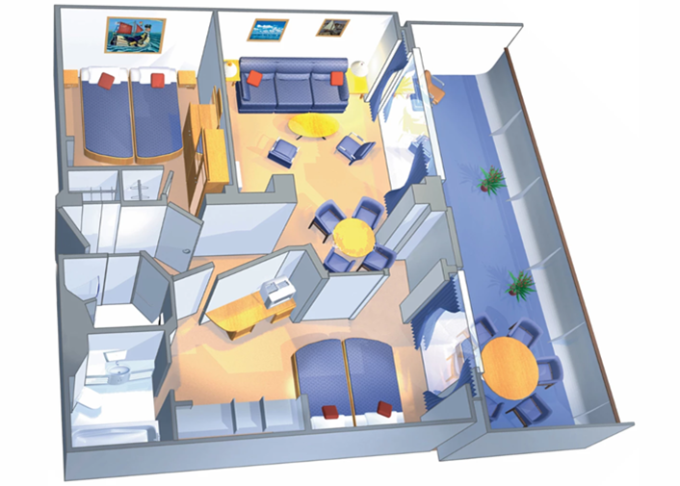 | VP - Ocean View Panoramic Suite (bez balkonu) 37 m². Panoramatické neotevíratelné okna. Výhody Royal Suite Class. 12. paluba. Max 6 osob. | 67 345 Kč 33 672 Kč za osobu |