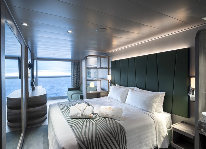 Kajuty Infinite - VL1, VL2 - s panoramatickým oknem; některé kajuty jsou s oknem, které se po otevření změní na skleněnou balustrádu.
