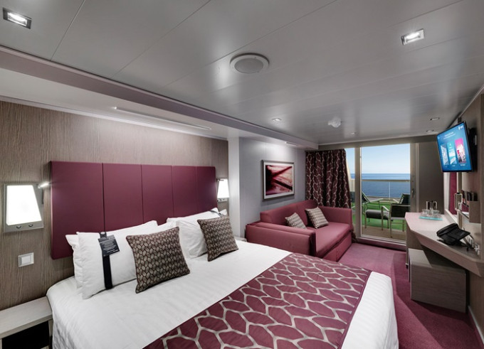Kajuta s balkónem: 16 -17 m², kajuta s manželskou postelí (na požádání 2 oddělené postele) a rozkládací pohovka. Klimatizace, koupelna se sprchou nebo vanou a WC, toaletní stolek, prostorná skříň, interaktivní TV, telefon, sejf, vysoušeč vlasů. Balkony se stolkem a židlemi. Některé kajuty mají omezený výhled.