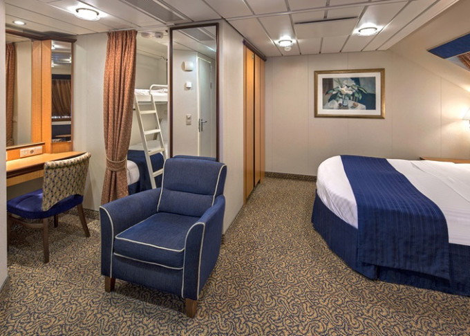 | 1K - Velká vnější kajuta Ultra Spacious 24,5 m². Neotevíratelné okno. 7/8. paluba. Max. 6 osob. | 112 014 Kč 28 003 Kč za osobu | ||