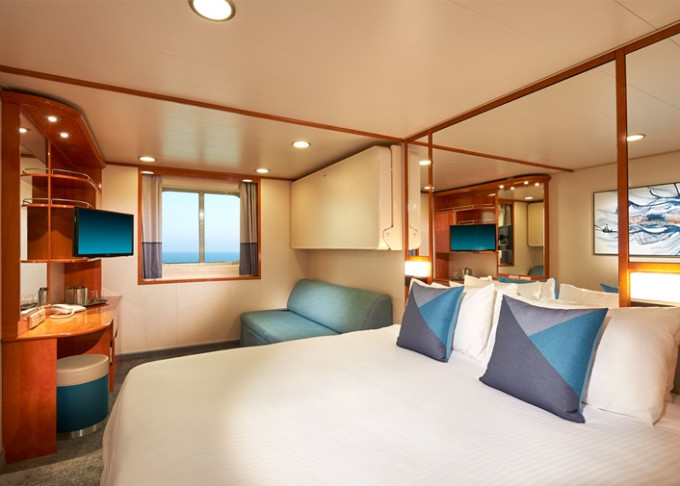 koupelna se sprchou a WC, 2 lůžka, v některých kajutách možnost přistýlek, toaletní stolek, úložné prostory, interaktivní TV, sejf, telefon, vysoušeč vlasů.