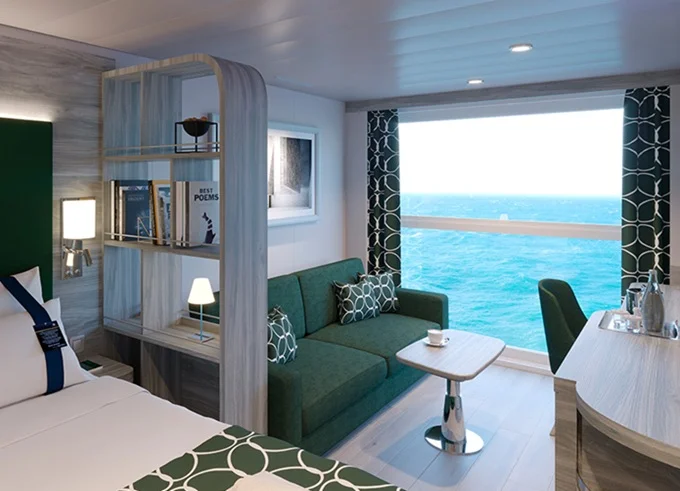 Kajuty Infinite - VL1, VL2 - kajuty s panoramatickým oknem, některé jsou se zasouvacím oknem, které se po otevření změní na skleněnou balustrádu.