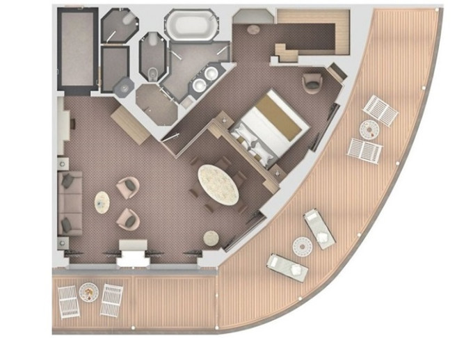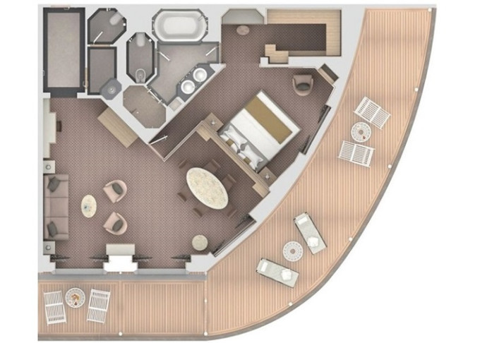 | R1 - Royal Suite 1 105 m² (včetně balkona). Ložnice, obývací a jídelní část. | 1 296 688 Kč 648 344 Kč za osobu | ||