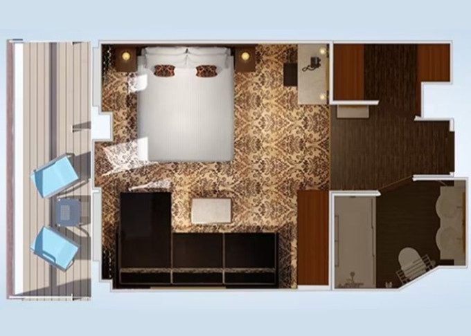 | 7C - Kajuta s balkónem Cca 21 m² ( kajuta i balkón); balkon je částečně chráněný - "cove". | 43 389 Kč 21 695 Kč za osobu | ||