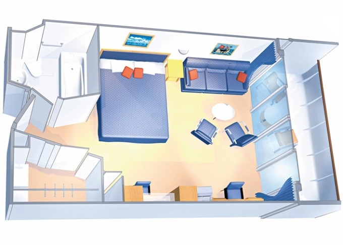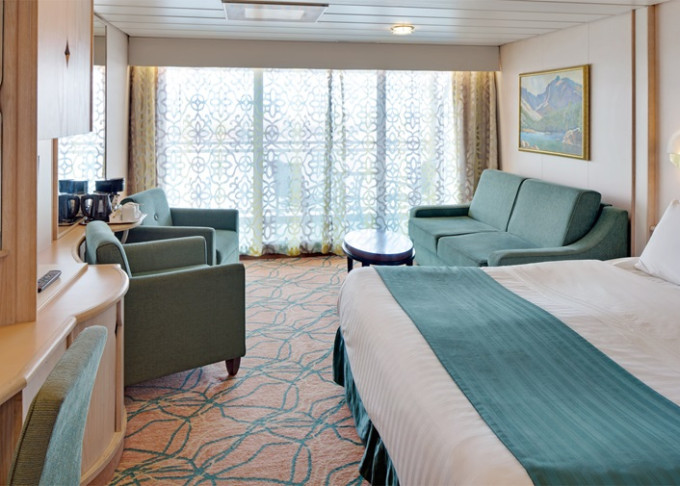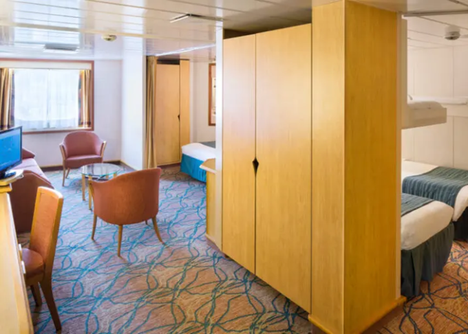 | VO - Ocean View Suite (bez balkonu) 44 m². Panoramatické neotevíratelné okna. Výhody Royal Suite Class. 8. paluba. Max 6 osob. | 241 683 Kč 60 421 Kč za osobu | ||