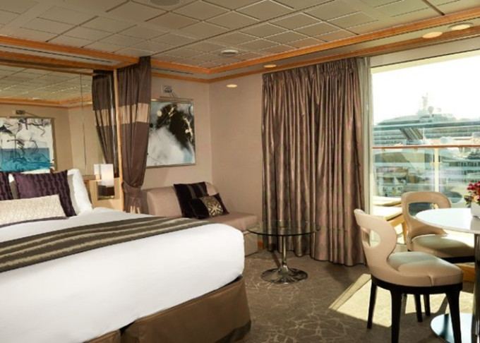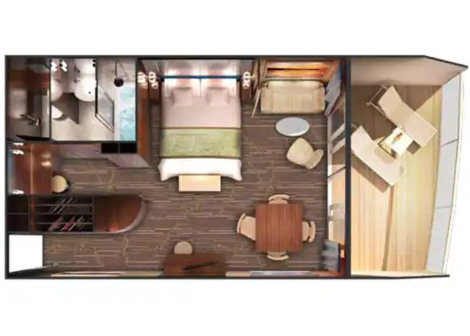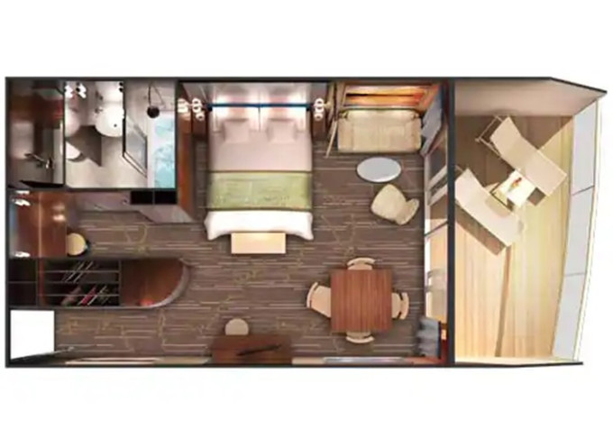 SM - Aft-facing Penthouse 35-37 m² / balkon 8-10 m². Výhody Suite. 8/10. paluba - vzadu. Max 3 osoby. 68 525 Kč 34 262 Kč za osobu
