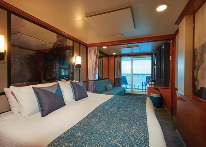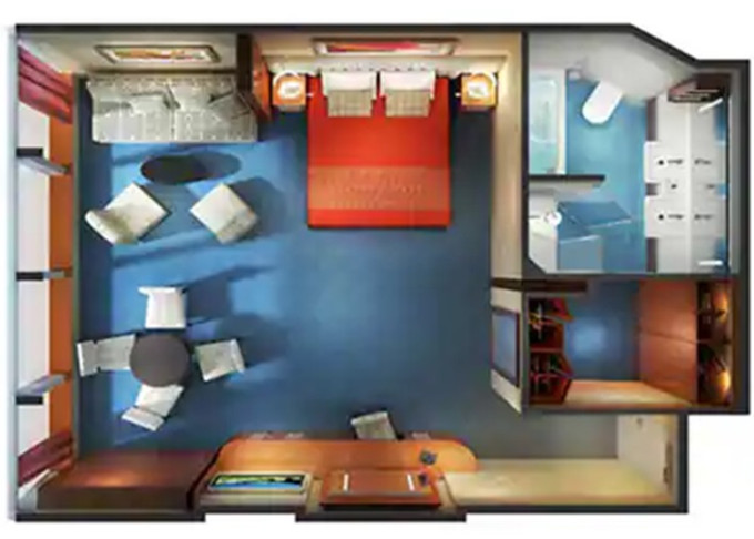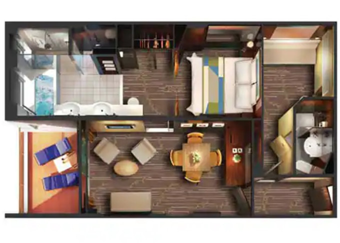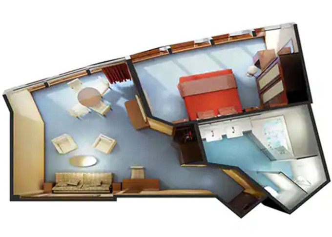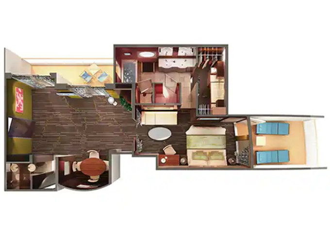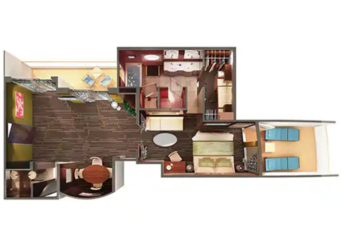 SD - Forward-facing Deluxe Penthouse 46-47 m² / balkon 12 m². Výhody Suite. 10. paluba - vpředu. Max 4 osoby. 74 260 Kč 37 130 Kč za osobu