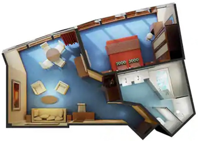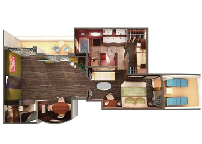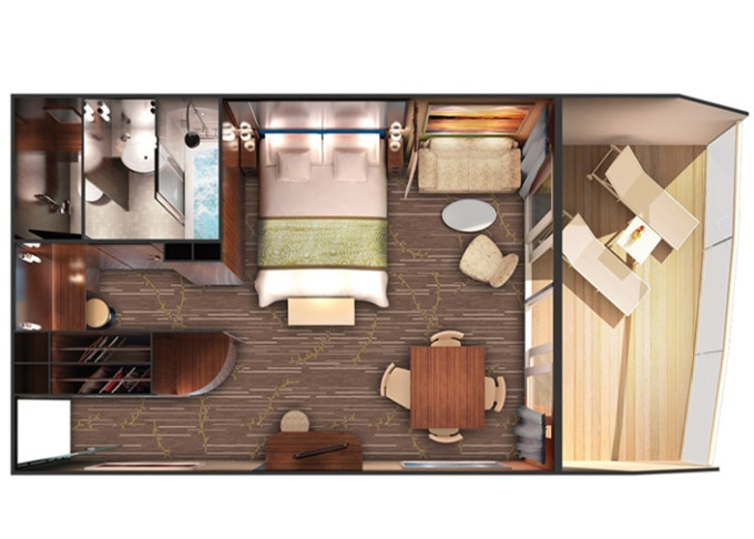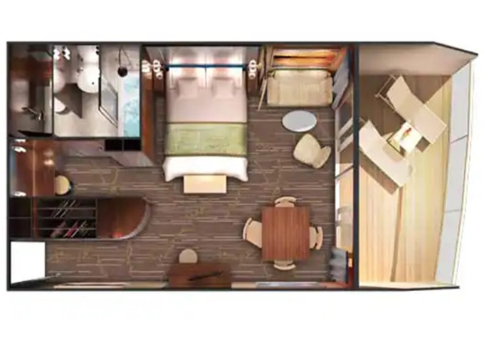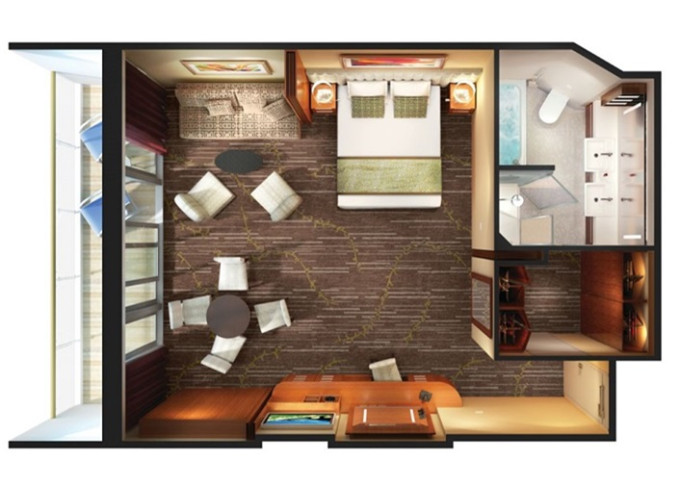SD - Forward-facing Deluxe Penthouse 48 m² / balkon 13 m². Výhody Suite. 10. paluba - vpředu. Max 4 osoby. 224 327 Kč 112 163 Kč za osobu