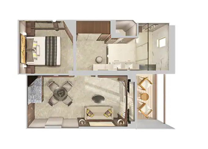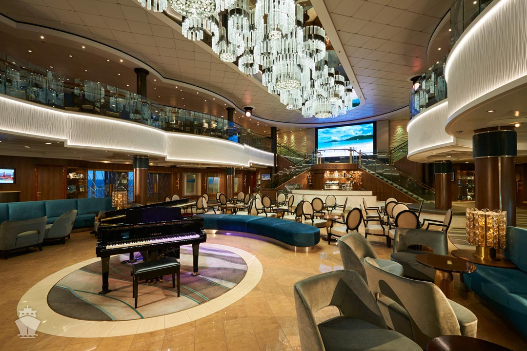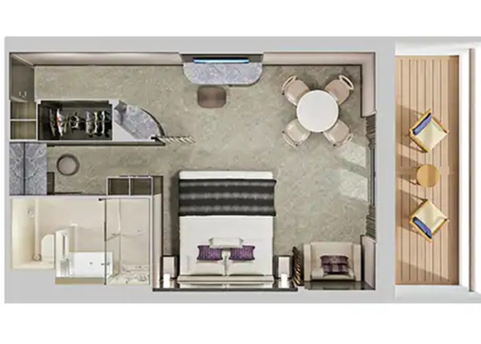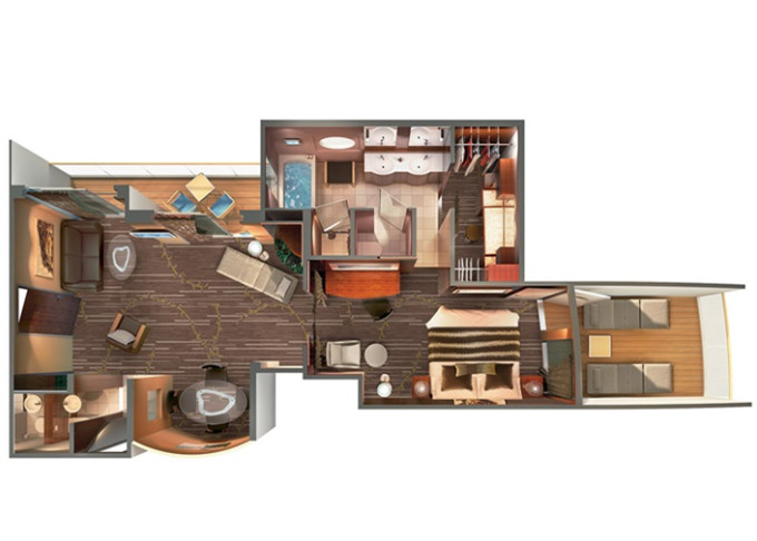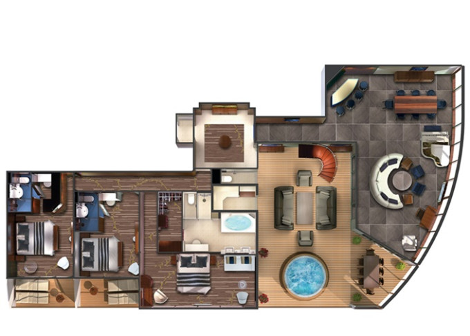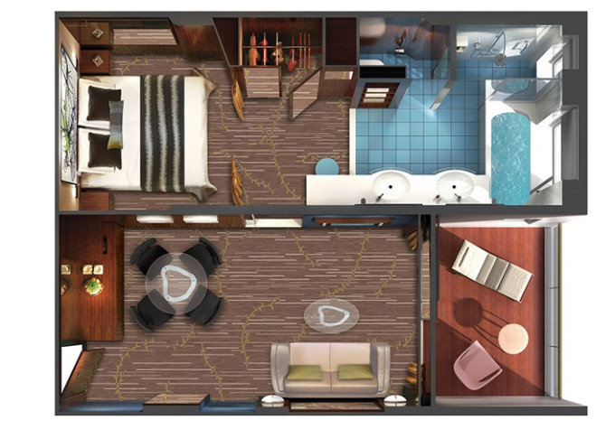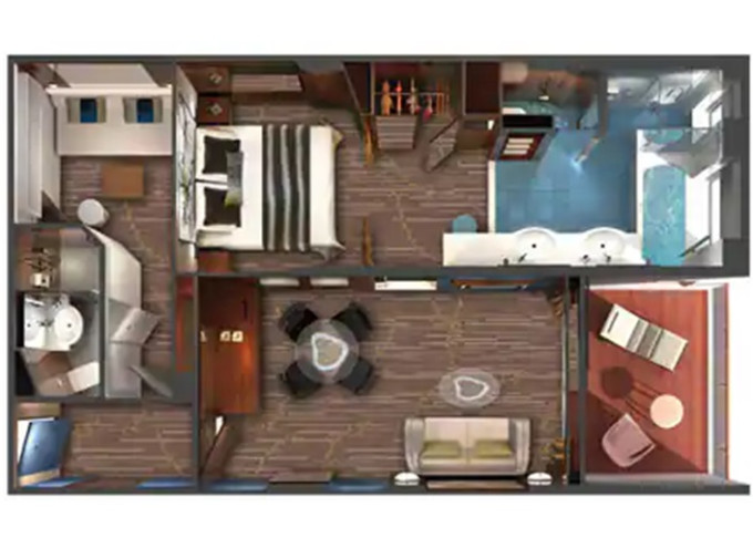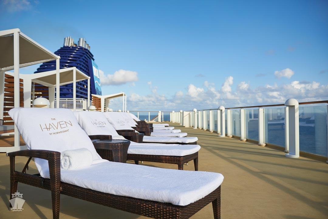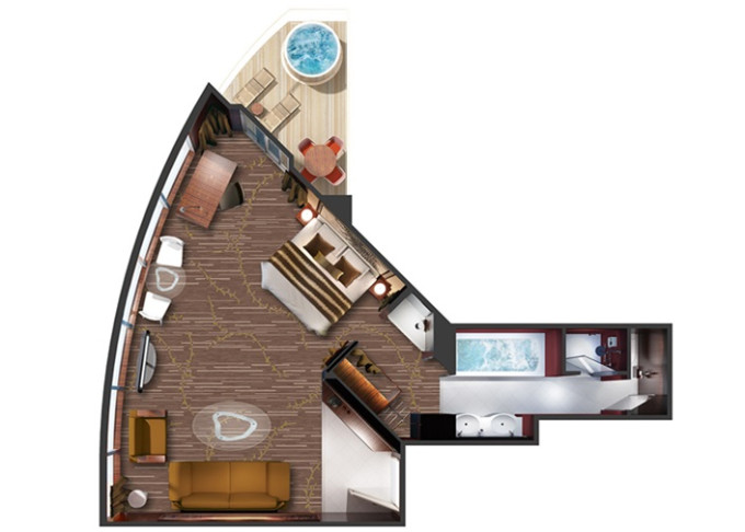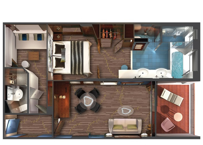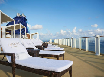 Suite: luxusní varianta ubytování na nejlepších místech na lodi, prostorné a luxusně vybavené; více variant včetně suite v privátní zóně The Haven