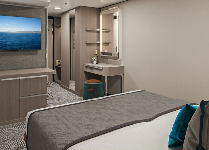 koupelna se sprchou a WC, 2 lůžka, v některých kajutách možnost přistýlek, toaletní stolek, úložné prostory, interaktivní TV, sejf, telefon, vysoušeč vlasů.