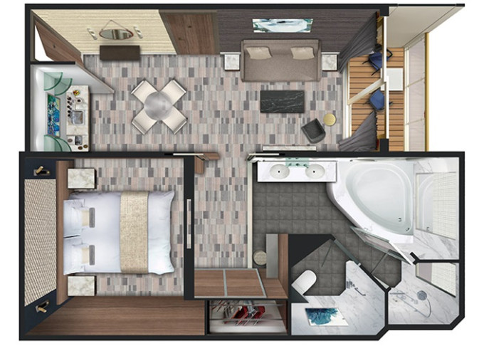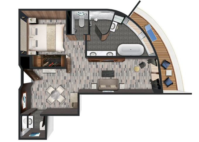 | SE - Forward-facing Penthouse 52 m² / balkon 11 m². Vířivka. Výhody Suite. 10. paluba - vpředu. Max 3 osoby. | 486 707 Kč 243 353 Kč za osobu | ||
