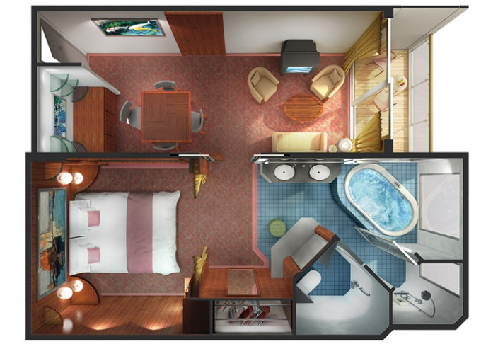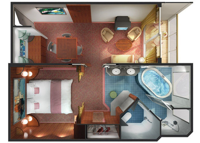 | SC - Forward-facing Deluxe Penthouse Suite 52 m² / balkon 11 m². Vířivka. Výhody Suite. 10. paluba - vpředu. Max 3 osoby. | 495 684 Kč 247 842 Kč za osobu | ||
