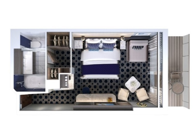 | B1 - Kajuta s balkonem Aft-facing od 20 m² / balkon od 4 m². 9. až 15. paluba - vzadu. Max 2-3 osoby. | 118 747 Kč 59 373 Kč za osobu | ||
