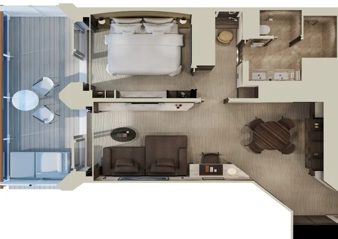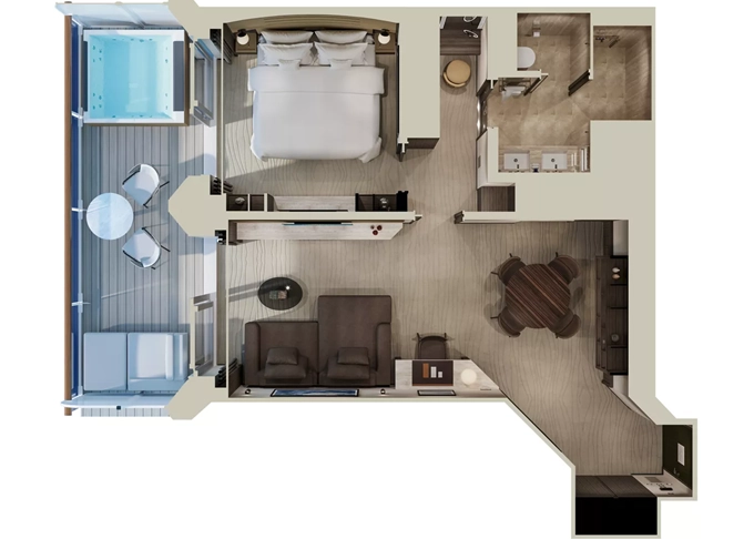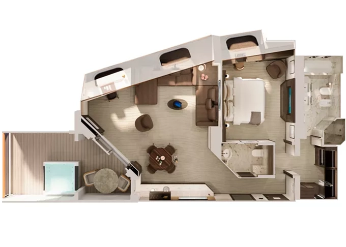 | Ocean Suites - Ocean Terrace Suite OT1 Suita 28 m² + terasa 7 m². 6. paluba střed / 7. paluba vepředu, vzadu. Maximální kapacita 2 dospělé osoby a 1 dítě do 17,99 let. | 171 063 Kč 85 532 Kč za osobu | ||