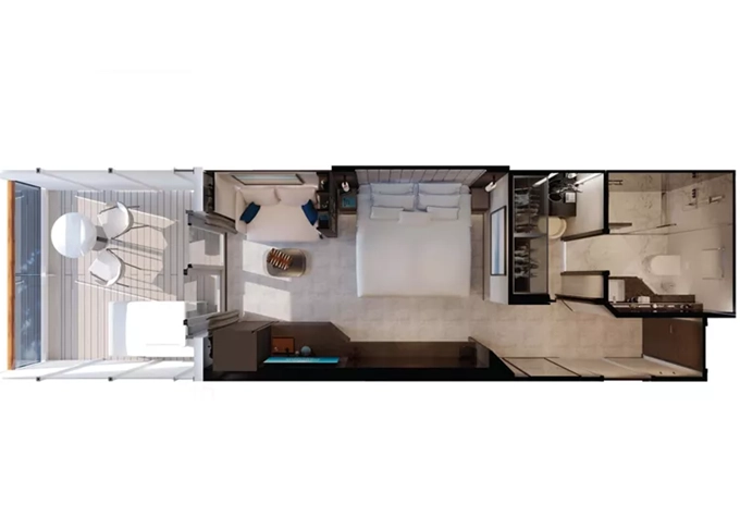 | Ocean Residence - Cove Residence Suita + terasa se sezením a lehátky 56 m². Ložnice s obývací a jídelní částí, šatna. Koktejlová souprava, minibar, kávovar, vodní konvice, dalekohled, sejf, koupelna se sprchou. Závěsy, světlo, klimatizace ovládané smart technologií. Brašna Technogym Case Kit. Láhev šampaňského na uvítanou. Maximální kapacita 3 osoby. | 405 838 Kč 135 279 Kč za osobu | ||