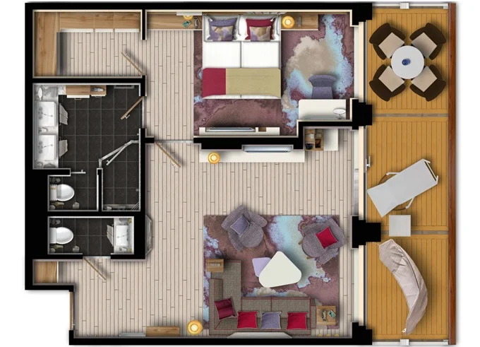 | JKAO - Junior Suite s balkonem 26 m² + balkon 8 m² se stolem. 10. paluba. Max 4 osoby. Výhody Junior Suite. | 87 227 Kč 87 227 Kč za osobu |