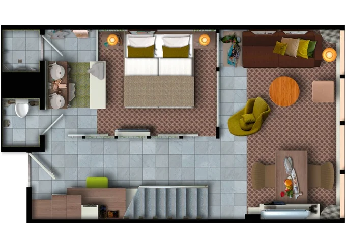 SUTO - Themen Suite 54 m² + balkon 15 m² se stolem, lehátkom a houpací sítí. Ložnice, Obývací část, šatník. 14. paluba. Max 4 osoby. Výhody Suite. 413 893 Kč 206 946 Kč za osobu