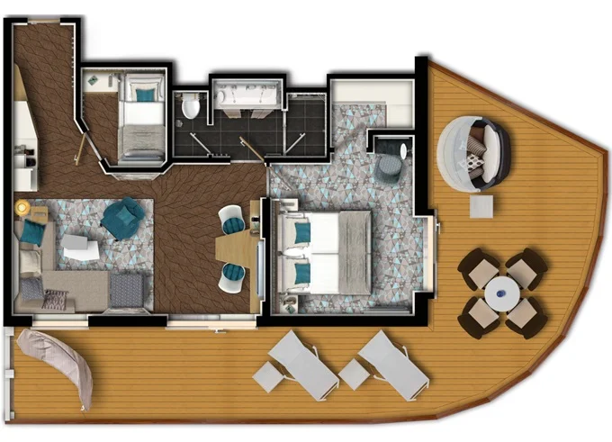 | SUDO - Diamant Suite 42 m² + balkon 47 m² se stolem se 4 židlemi, s houpací sítí, 2 lehátky a postelí Sun island. 2 ložnice, obývací pokoj, Herní konzole. 6. paluba. Max 6 osoby. Výhody Suite. | 250 759 Kč 62 690 Kč za osobu | ||
